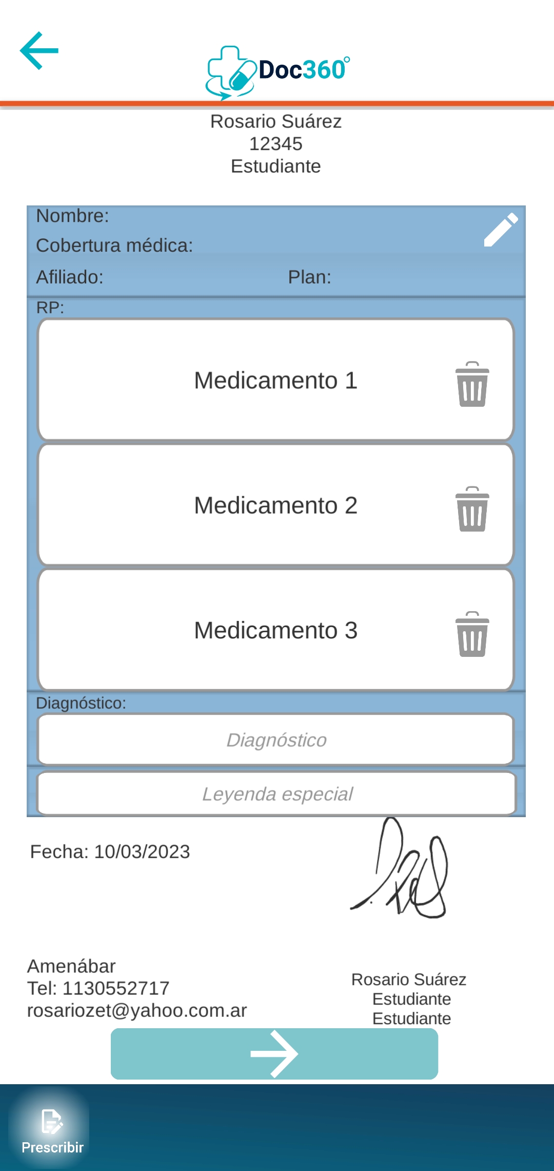 Podrás visualizar una receta de prueba para ver cómo quedaría y luego enviarla por email o WhatsApp al paciente.