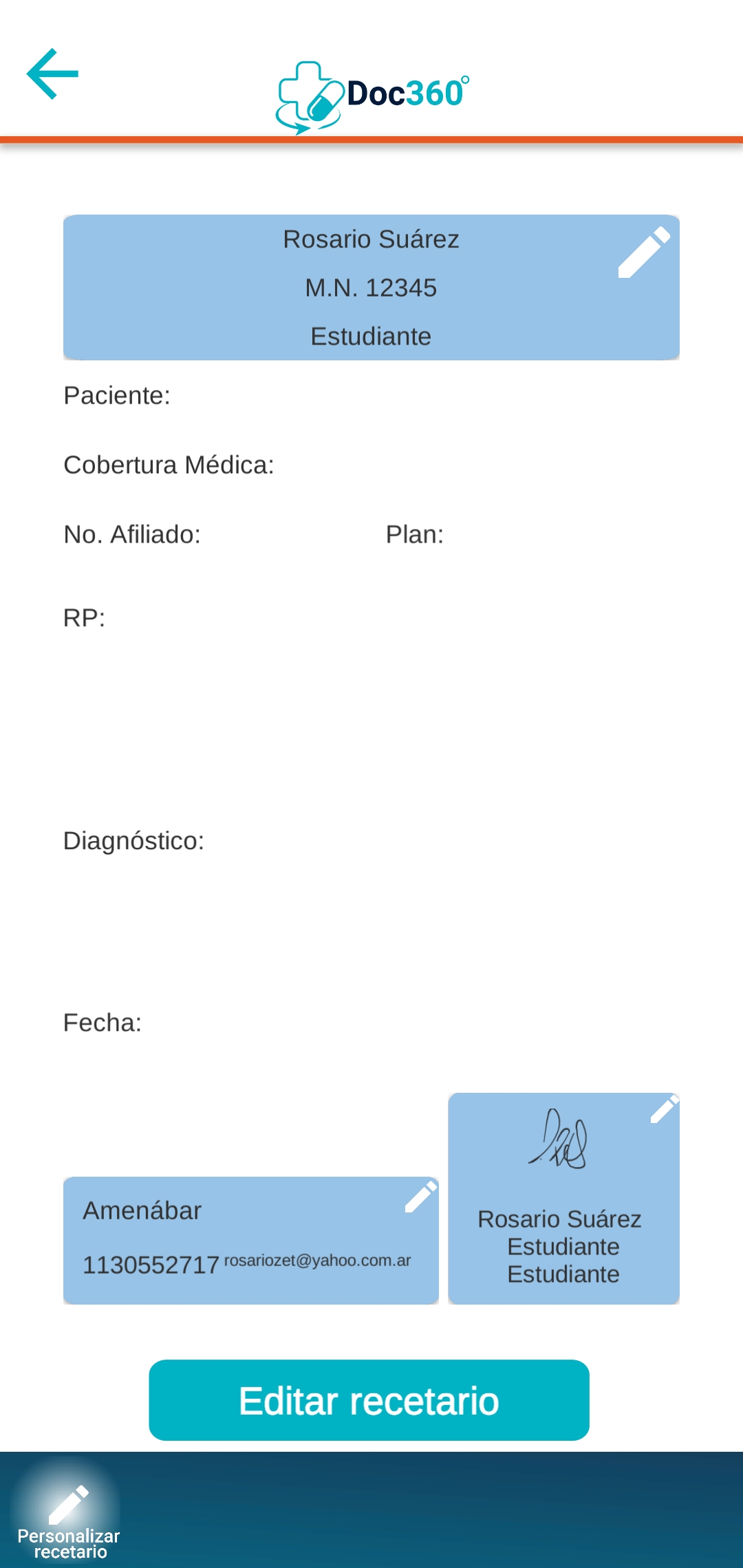 Una vez registrado con tus datos básicos de contacto ya puedes crear tu recetario, simplemente ingresas los datos personales que deben ir en tu recetario (nombre completo, número y tipo de matrícula, especialidad, dirección del consultorio, etc).